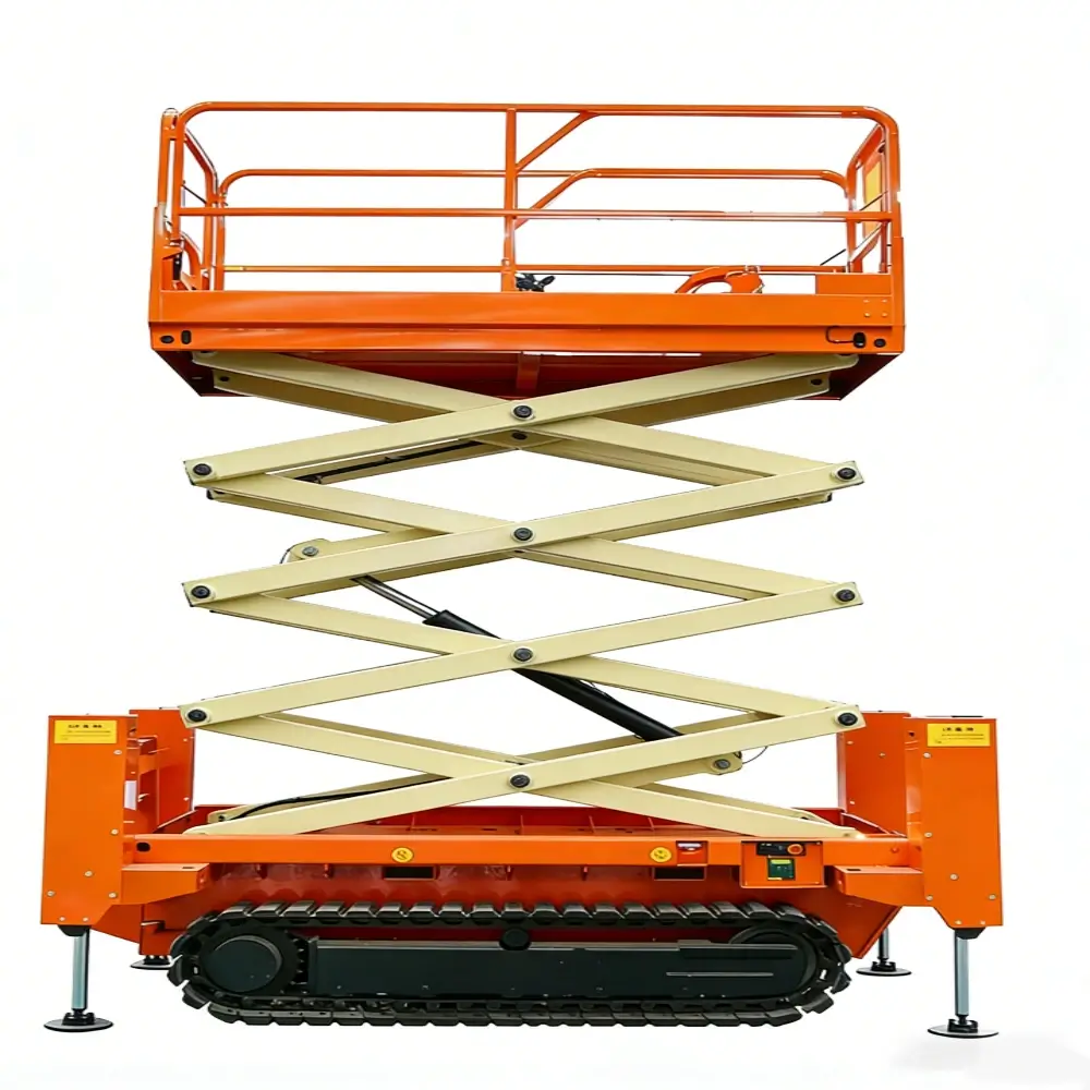 The tracked scissor lift adopts a rubber track design, offering low ground pressure and strong passability. It can operate stably on muddy, sandy, grassy, and other complex surfaces, making it suitable for applications with high ground protection requirements.It can also be equipped with steel tracks for enhanced durability and performance in harsh working conditions.