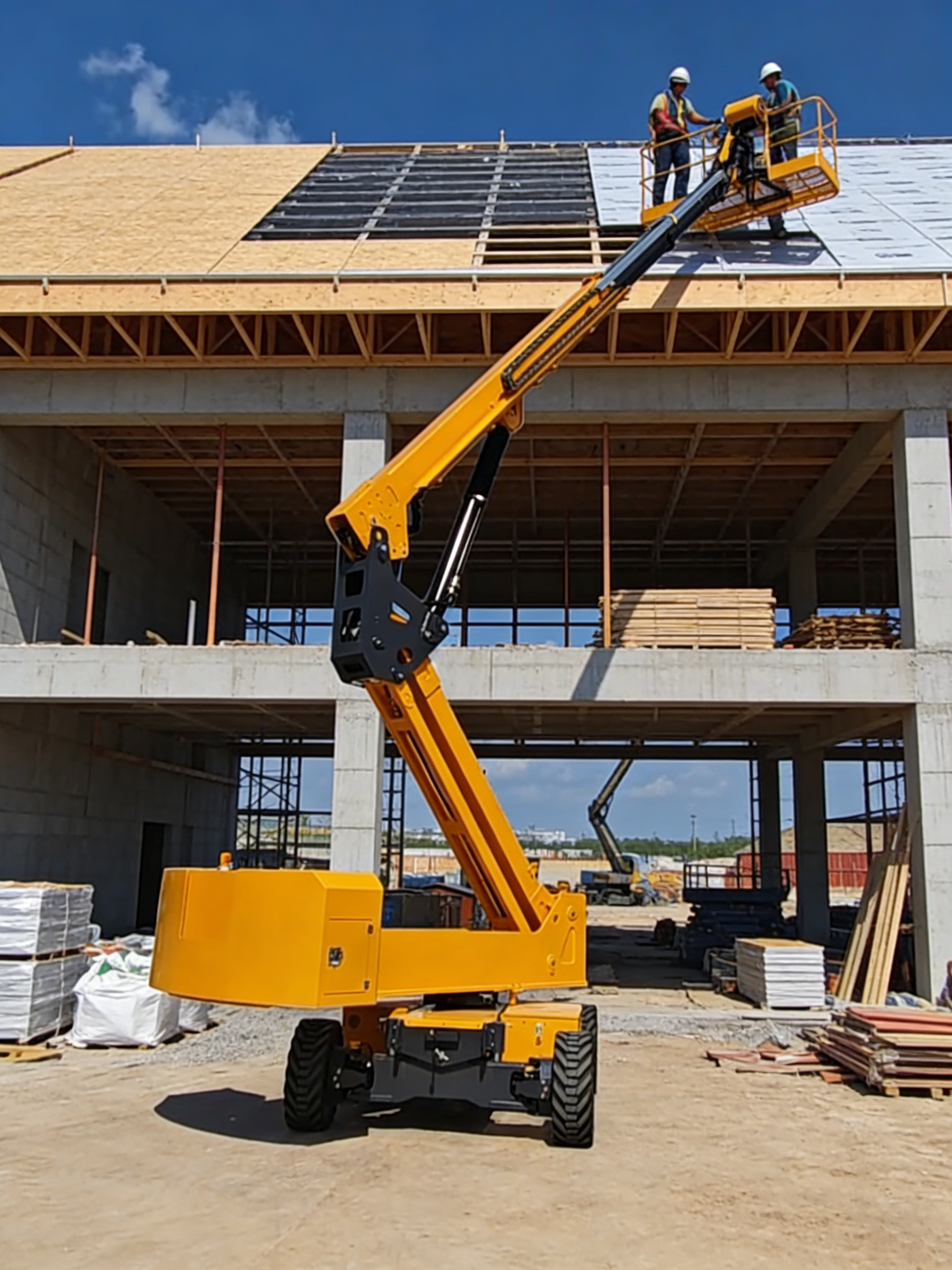 1.In construction and building work, telescopic boom lifts are mainly used for medium to large projects, high-rise building exteriors, bridges, and other infrastructure tasks such as facade construction, glass/curtain wall installation, steel structure assembly, bridge and dam inspection and repair, roof work, window and door installation, painting and decoration, and building framing.